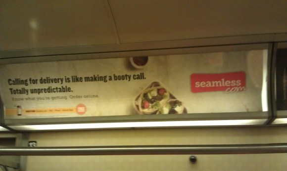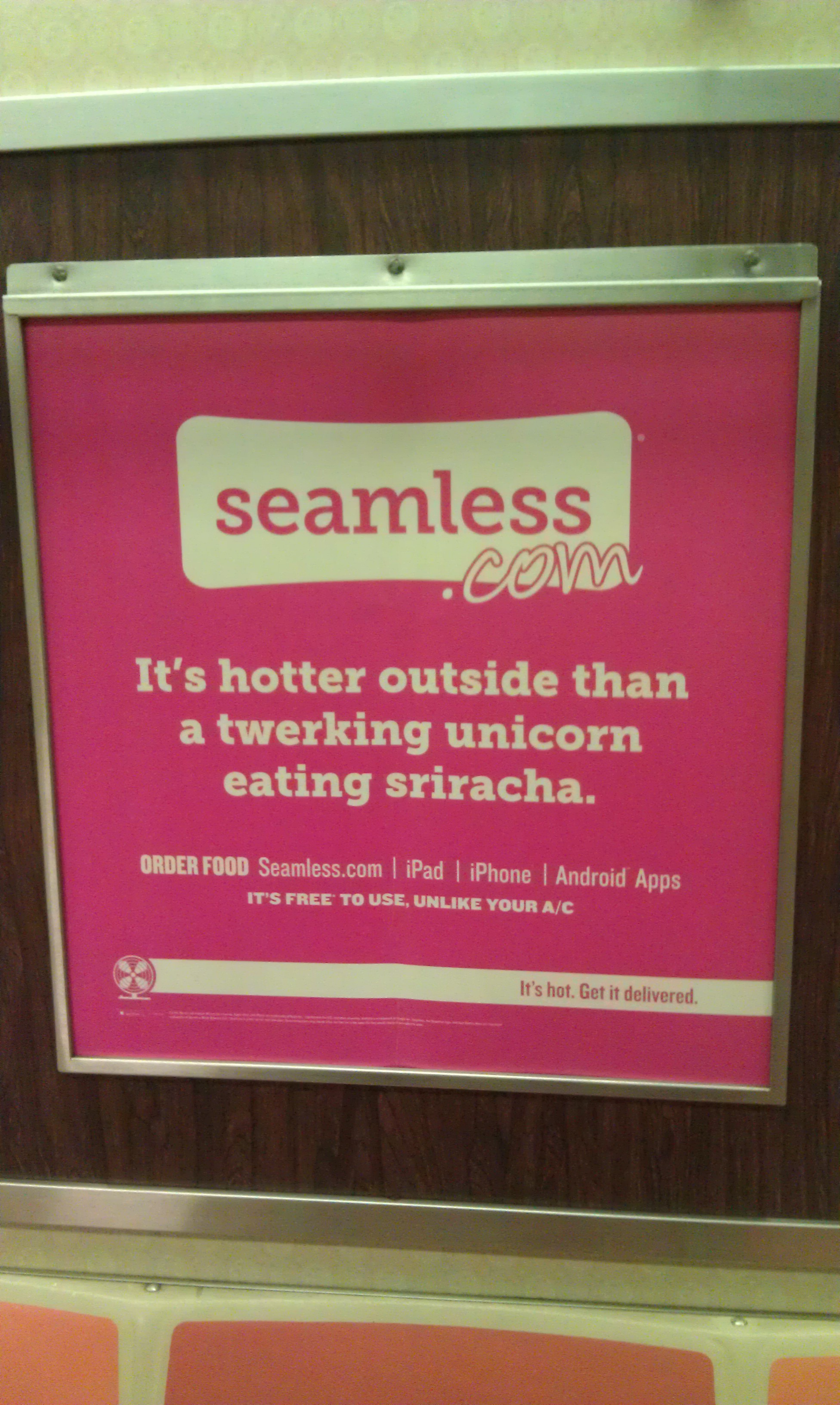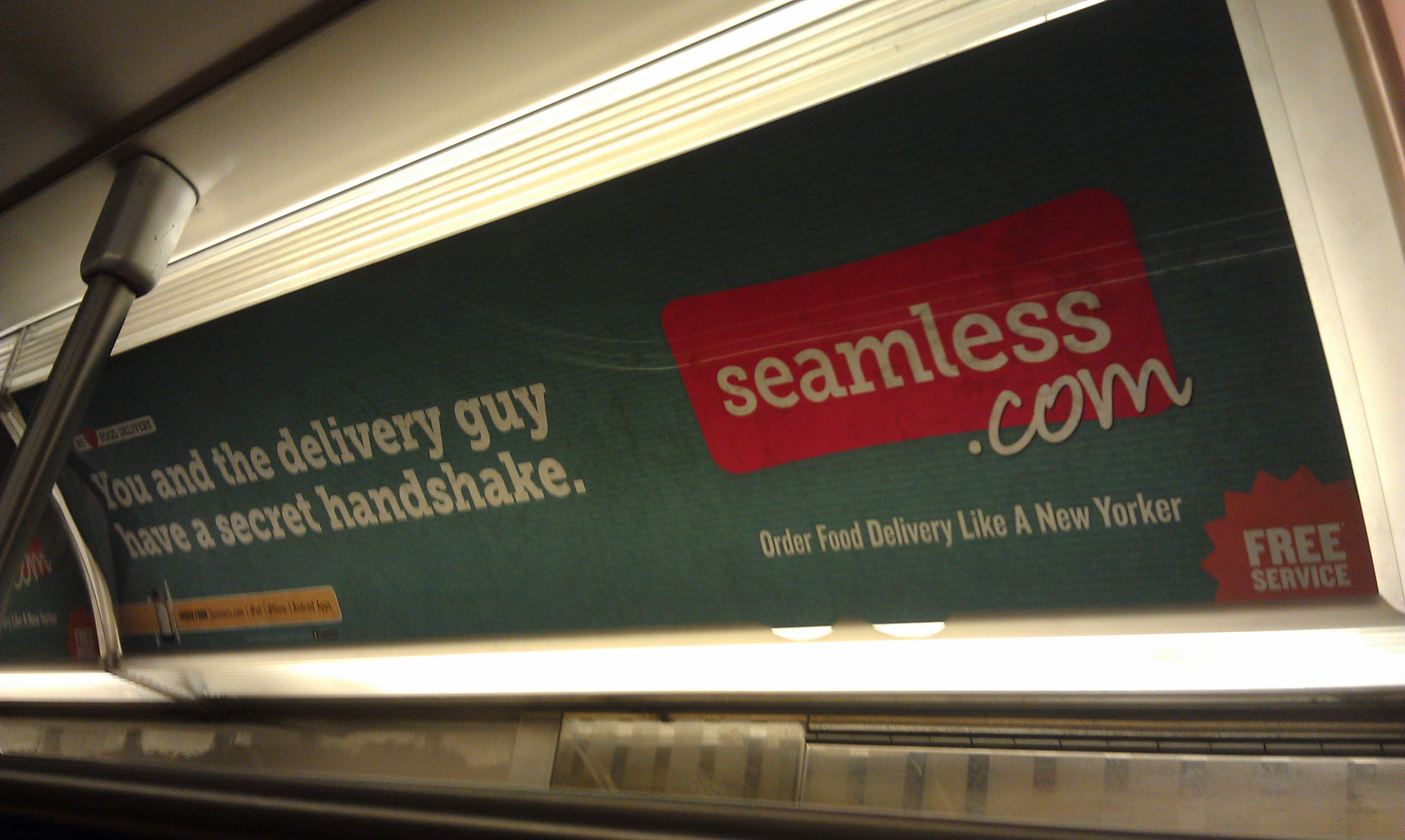 One of the unwritten rules of New York public transit is to avoid eye contact at all costs. For this reason, ad space is sometimes monopolized by one company for an entire subway car, forcing you to read every single ad. Often these are the exact same ad over and over, but some campaigns and brands are honestly a pleasure for me to read, and I am only slightly ashamed to admit that I look forward to reading the copy of seamless.com: